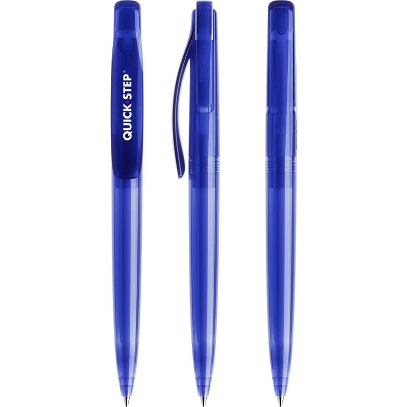 Plastic ball pen with blue-writing refill and 4 different clips. Customizable with print on the shaft